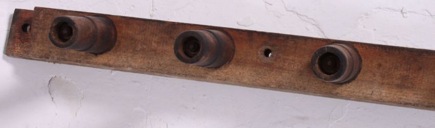 A large 20th century Industrial coat rack, the pegs of unusual form mounted to planked rear.