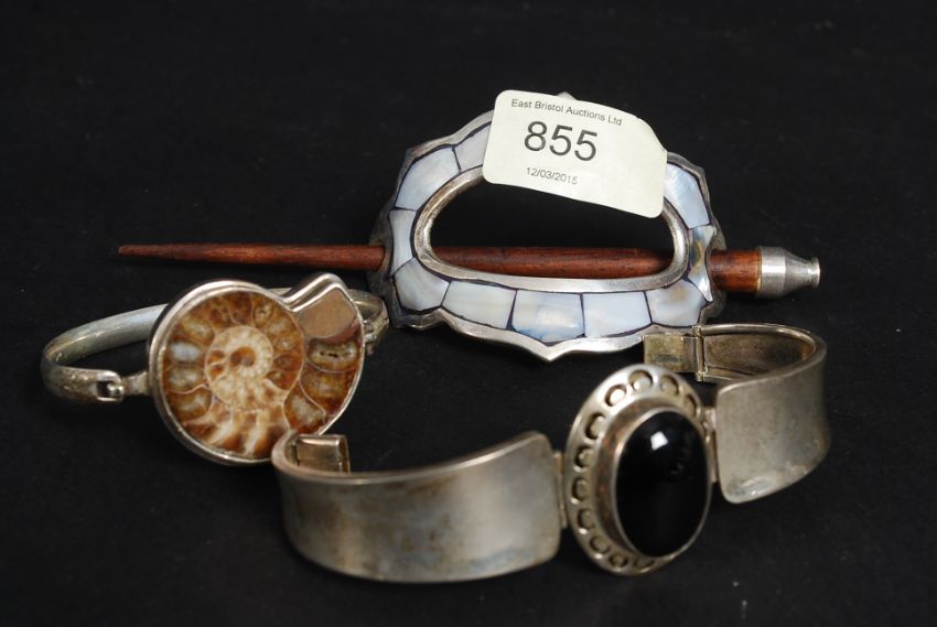 A 925 white metal silver ladies hat pin, along with a fossil inset bracelet (white metal) and another. Measures: 126g.