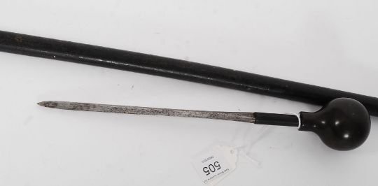 A 20th century ebonised sword stick / waking stick. The ebonised tapered shaft with ball finial top and knife set within