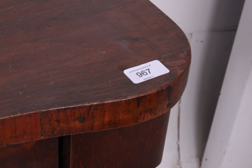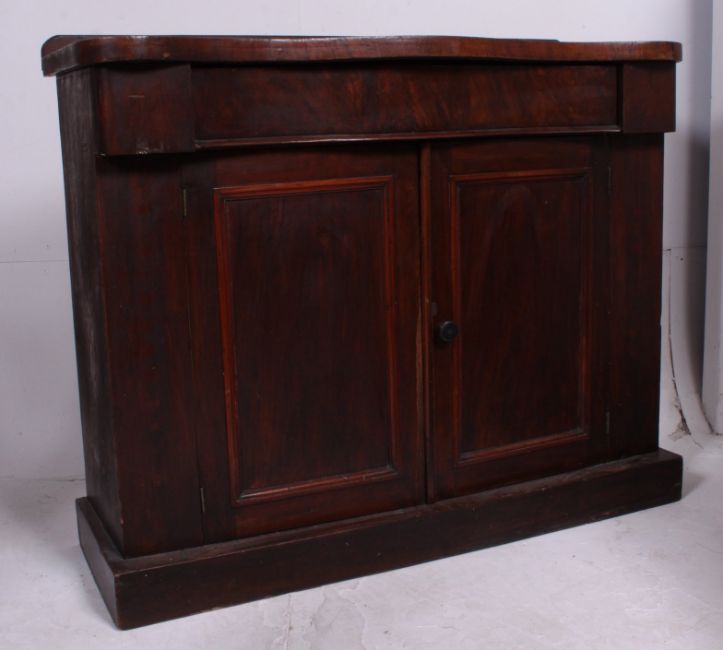 A Victorian mahogany chiffonier sideboard raised on plinth base with twin door cupboard under single drawer. Finished with a flared top above. H 82cm W 105cm D 34cm