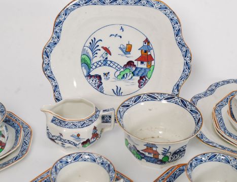 A vintage 20th century Chinese influence / willow pattern part tea service comprising cups saucers, plates etc by Westover RD 737159. 8cm H
