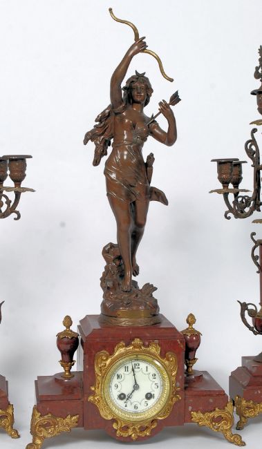 A fantastic 19th century rouge marble mantel clock and candelabra garnitures. The brass movement stamped A*B for Achille Brocot ' D Paris'. 8 day movement striking on a gong. The clock topped by a bronze sculpture after Kossowski, with signature to base. The garniture each raised on brass gilt feet, and the candelabra's complete with the original snuffers to top.
