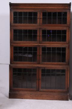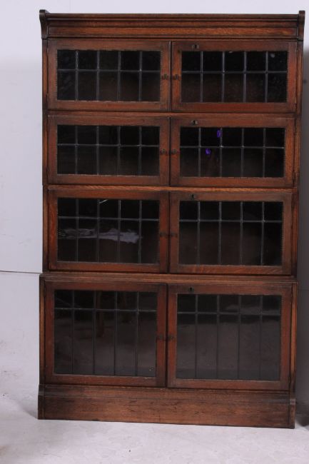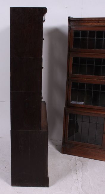 2 ( A Pair of ) excellent quality Victorian oak and leaded glass lawyers stacking bookcases. The upright sectional bodies with lead glass door fronts, each in the manner of Globe Wernicke. 147 x 89 x 37