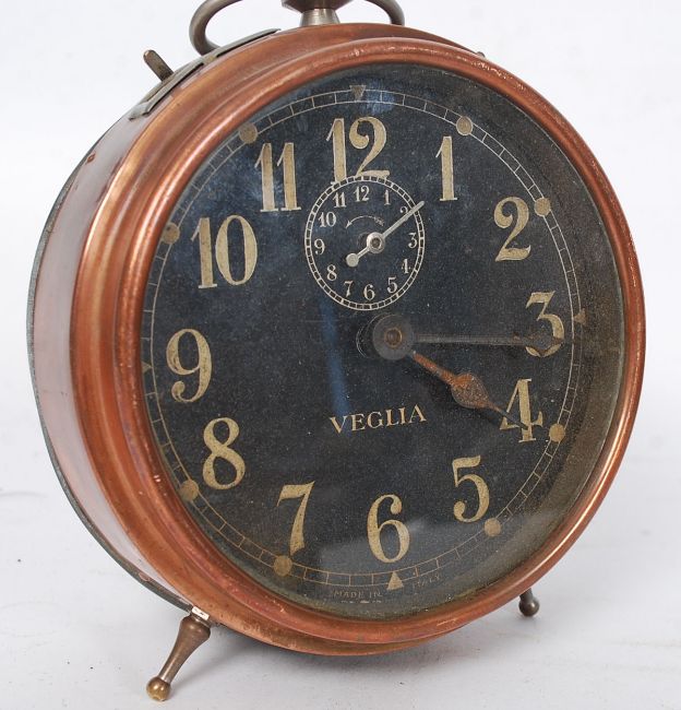 A Veglia ' Made In Italy ' unusual copper alarm clock with black dial. 16cm H 13cm Dia