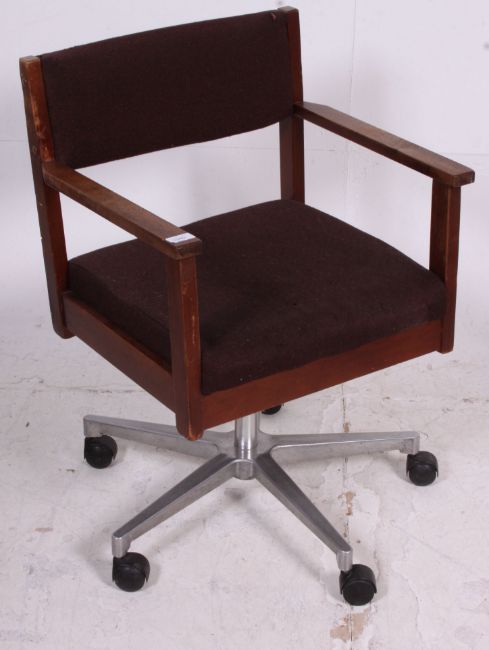 A vintage 1970's Industrial School teak and velour upholstered teachers swivel chair. Wooden elbow rests over quadruped chrome swivel base