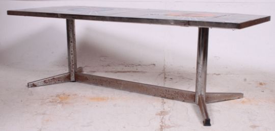 A good 1970's retro chrome and tile top coffee table having stunning Fat Lava inspired tile top table with chrome supports and angular legs. 23cm H 30cm Dia