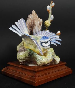 2 Royal Worcester limited edition figurines by Dorothy Doughty of birds on naturalistic bases having the wooden sconce supports complete with the certificates in frames. Wren and Burnet Rose - 120 Cock and Blue Tit & Pussy Willow - 177 Hen. 20cm H.