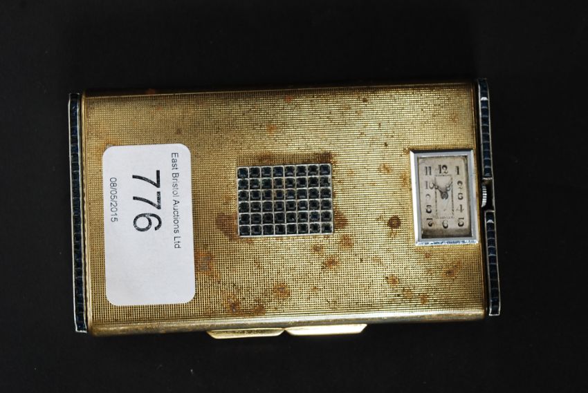 A 1930's Art Deco silver plate cigarette case / compact with inset clock and stone set embellished front. The interior with fitted mirror