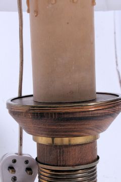 A 20th century wooden based table lamp with turned oak column base with a white shade to top.