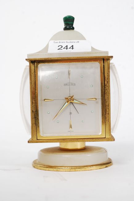 A Swiss ' Angelus ' onyx cased compendium, fitted clock, thermometer, barometer, hygrometer being raised on a circular revolving plinth base. 15cm H 10cm W