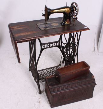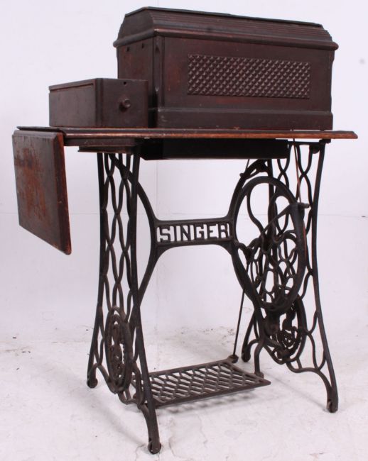A 19th century Victorian Singer sewing machine table having cast iron base with machine above. 74 H x 104 W x 41.5 D