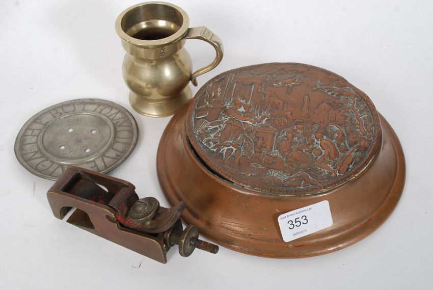 A copper 19th century bowl raised in relief together with an unusual ' you win the button ' pewter medal, a metal woodworking plane etc