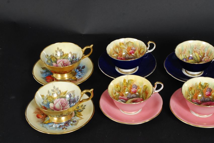 A collection of decorative 20th century Aynsley trios / cups and plates in gilded two tone, the other with floral sprays