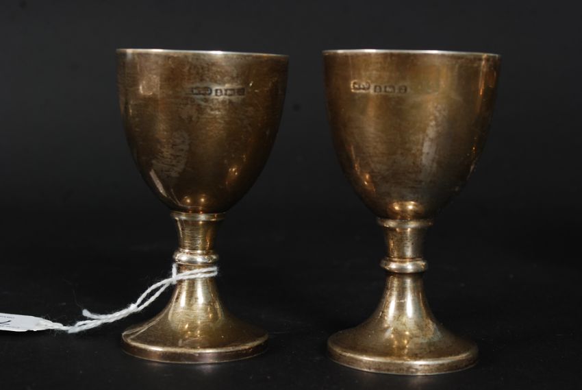 A pair of silver hallmarked duck egg / goose egg cups bearing hallmarks for Marson & Jones of Birmingham 1933. Measures 9cms high / weight 54.4g