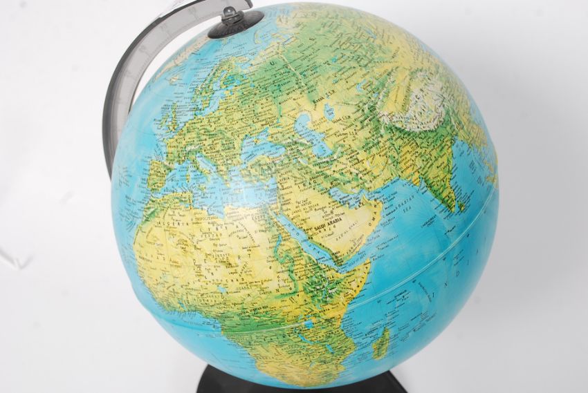 A 20th century retro desk top globe illuminating over plinth base with swivel action