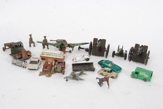 An assortment of vintage toys to include a Luftwaffe tin plate wind up plane, cannons, cars