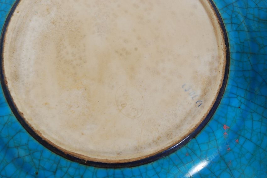 A French Longwy ceramic and enamel decorated plate together with a pair of flo blue plates having willow design, a stonweare conserve and a poole pottery conserve