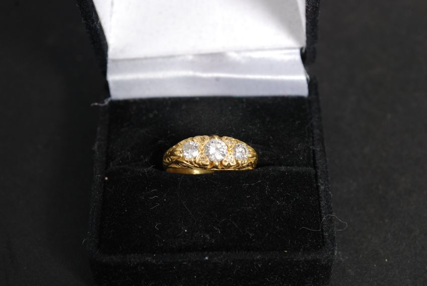 An 18ct gold 3 stone ladies diamond ring. The ring set with scolled head having inset 3 stones. The central stone .4cts, the flanking stones .3cts each / total 1.0cts. Size I/J. Weight 4.5g