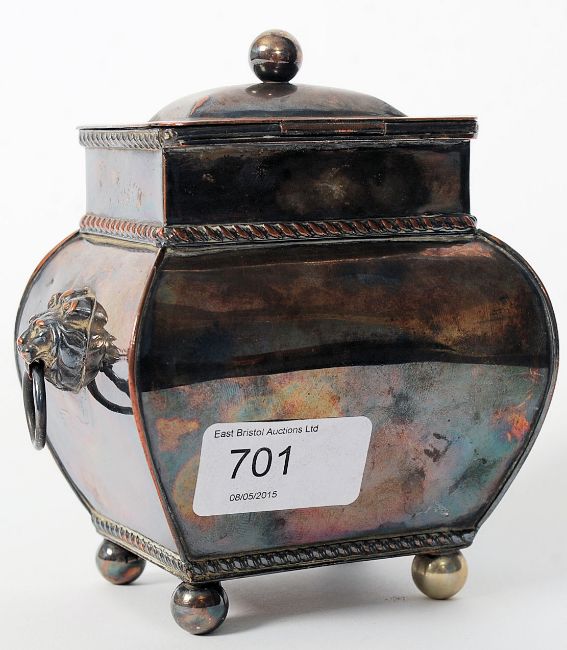 A Victorian / Edwardian silver plated tea caddy with lion handles standing on four feet. With opening lid to top.