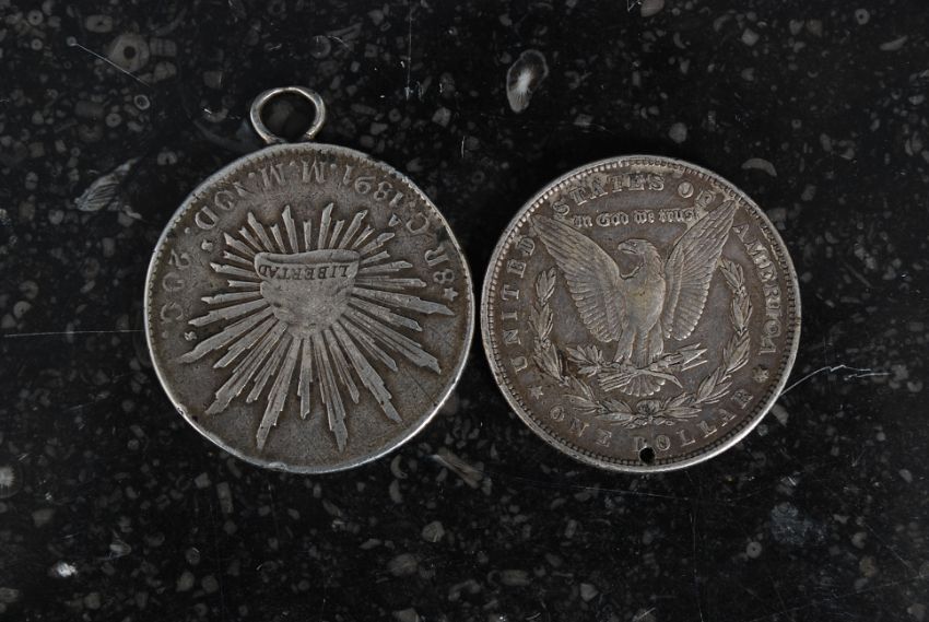 A Mexican reale coin, along with a USA American coin, both with silver content.