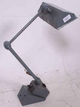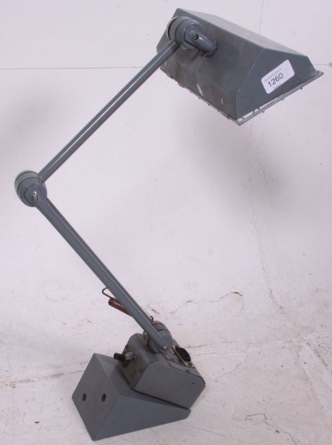 A heavy industrial anglepoise lamp with rectangular shade on strong arm with original grey painted finish set on the original mount. 74cm H 15cm W 15cm D