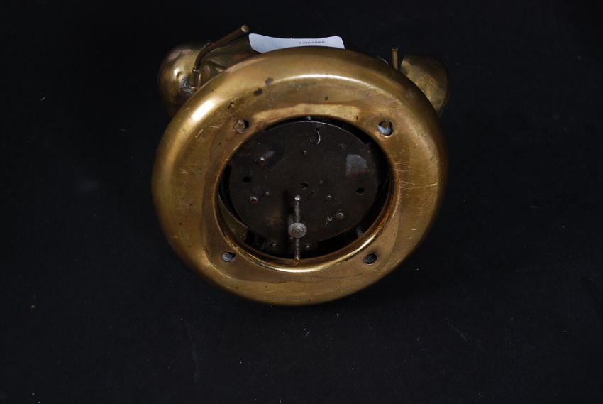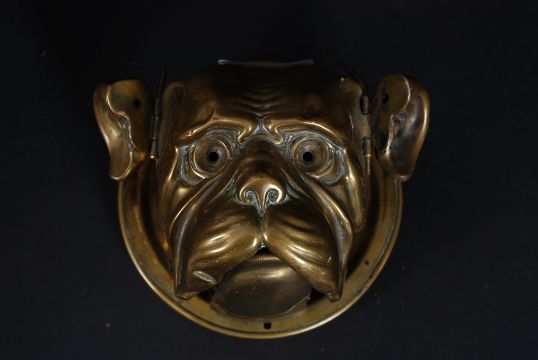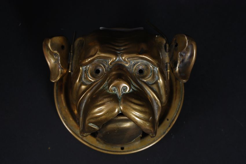 An fabulous and interesting brass counter top bell in the form of a British Bulldog. Unsure of its workings, the bell would appear to animate the dog when rung. Moving ears and mouth, the bell can be hand wound from the rear. Unusual.