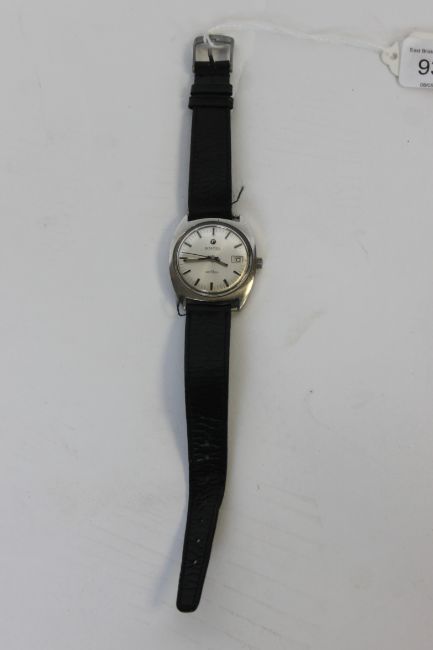 A gentlemans vintage Roamer Anfibio wristwatch on leather strap. Silvered dial with batons, black sweep hands with date aperture