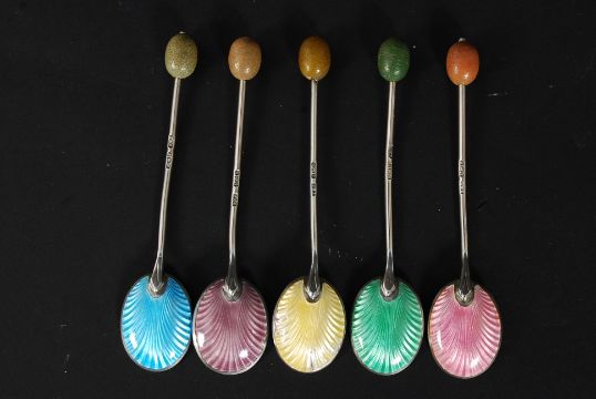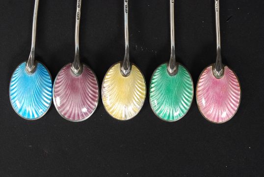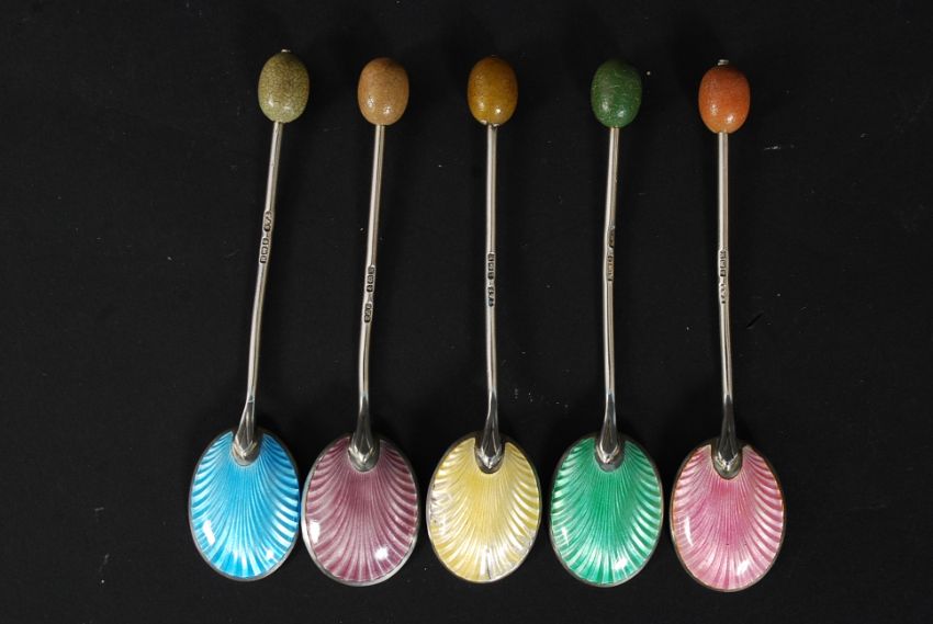 A set of 5 Art Deco 1930's silver and enamel hallmarked coffee bean spoons by Turner & Simpson dating to Birmingham 1936. Gross weight 40.1g