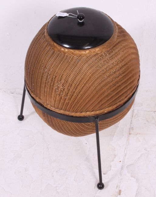 A Lloyd Loom Sputnik wicker linen basket, designed by Geoffrey Lusty, with wooden cover and painted metal tripod stand applied label to cover. 20in (52cm) high