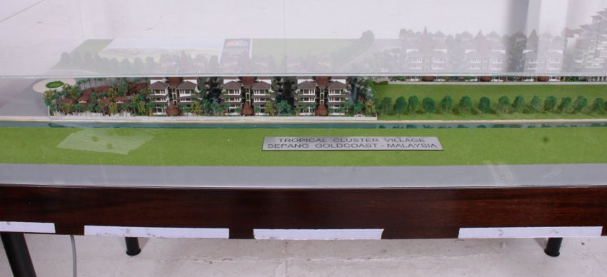A large architectural / architects model of a Malaysian village complete complete with electrics with the houses and pools lighting up. Set within the original large acrylic and hardwood case with removable legs / Ideal as a model display case / shop display haberdashery alternative use