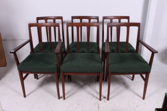 A good set of 6 1960's A Younger Ltd Teak Danish design dining chairs of excellent quality. Raised on shaped supports with original green upholstered padded seats having stunning feathered rail backs. Matching dining table, coffee table and sideboard in lots 1148 & 1147. Measures: 89cms x 50cms.