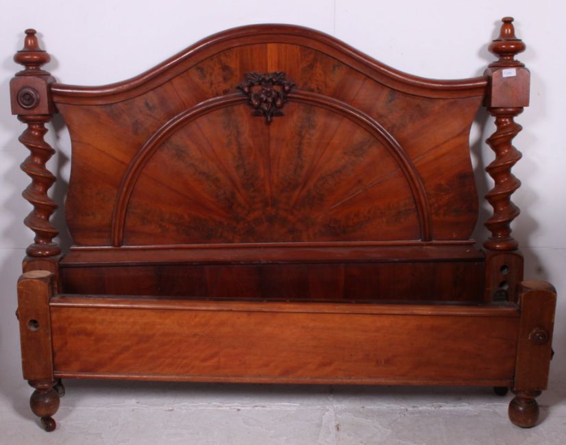 A Victorian mahogany double bed. The profusely carved head and footboards having later applied mounts for Vono cast iron rails. 95cm H 150cm W 13cm D ( no irons / easily found )