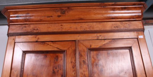 A 19th century French walnut armoire double wardrobe. The beautiful flared cornice over double doors with shelf to interior being raised on stunning shaped plinth with pad feet. Near matching 2nd armoire in lot 1325. 225cm H 147cm W 70cm D