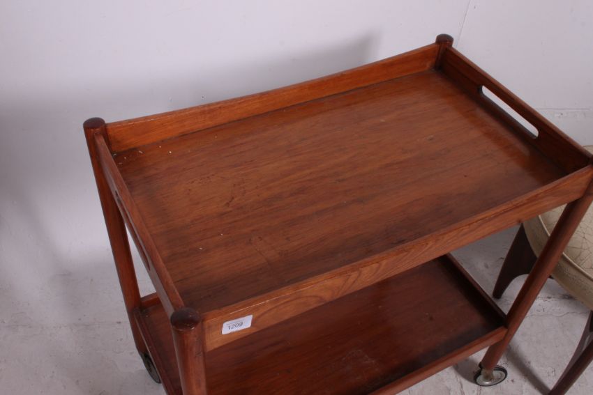 A retro 1970's teak Danish style buffet tea trolley together with a cream faux leather circular teak wood stool by G-Plan. 72cm H 71cm W 43cm D