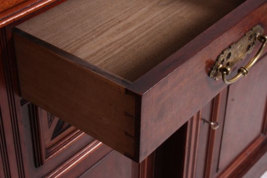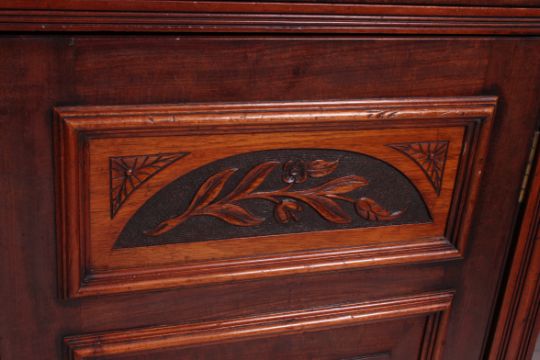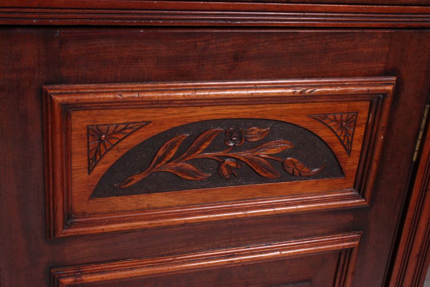 A good quality large Art Nouveau carved walnut sideboard dresser. Raised on a plinth base with carved details to the doors and drawers having original brass handles and complete with keys. 97 x 156 x 55