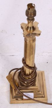 A vintage style brass standard lamp together with a similar table lamp in brass, hanging corner cabinet with single door. 139 H x 37 W x 29 Dia