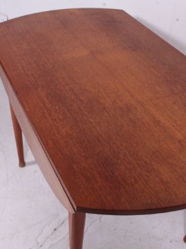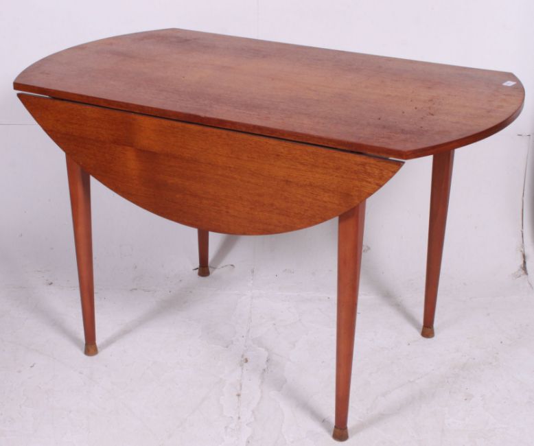 A retro 1970's large vintage teak drop leaf circular double drop leaf dining table raised on tapered supports Measures,. 74 x 120