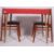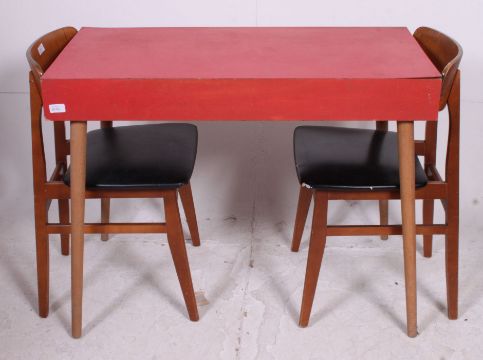 Retro red formica kitchen table having detachable legs with a pair of black vinyl retro chairs. 73 H x 96 W x 50 D