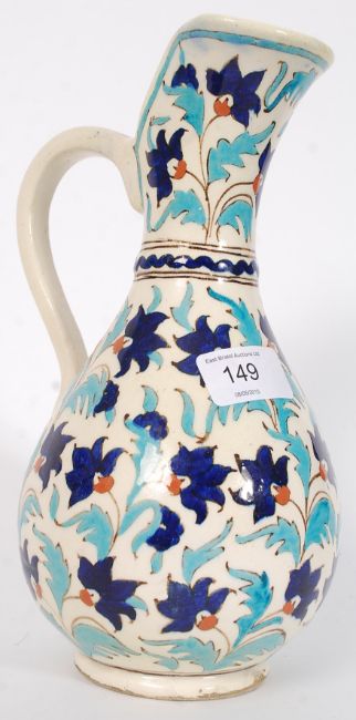 A Persian ? Iznik style glazed pottery jug having polychrome decorated finish of scroll work on a beige ground