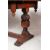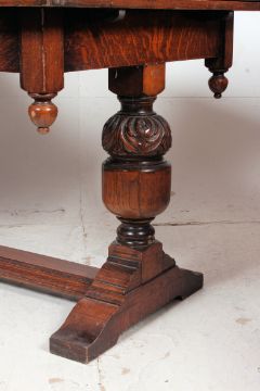A 1930's Art Deco carved oak draw leaf dining table raised on cup and cover supports united by stretcher having inverted finials