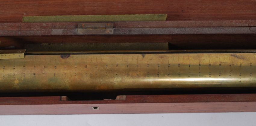 A 19th century brass Soleil surveyors telescope, with notation to eyepiece, and brass sliding scale to top. Within the original wooden case.