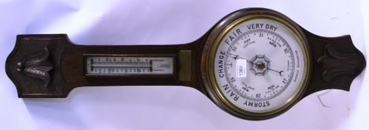 A 1930's Oak Aneroid banjo barometer having original brass notation plaque dating to the 1930's along with a thermometer to the stem