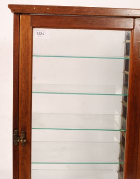 A Victorian solid oak haberdashery / shop display cabinet with several glass shelves to the interior and opening glazed door to front. Plinth base with cornice top. Hi 35cms width x 68cms high x 20cms depth