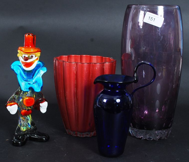 A collection of coloured glass items to include a Murano glass clown, purple glass vase, Bristol Blue and a ribbed red coloured vase