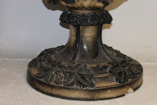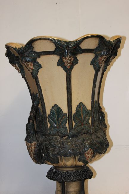 A very large floor standing 19th century Majolica style glazed stoneware garden planter urn raised on circular plinth. 64cm diameter, 109cm tall.