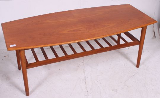 A large vintage retro 70's Teak surf board style coffee table with slatted magazine rack to underside. 47 x 120 x 55
