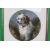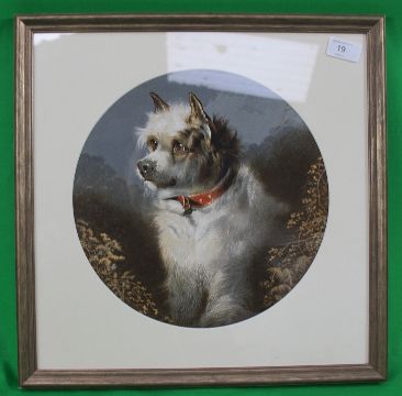 A 20th century portrait painting of a white dog with a red collar. The pictures is unmarked and unsigned, framed and glazed. Measures: 29cms diameter.