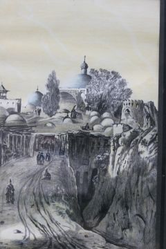 A lithograph painting in crayon / sketch depicting a village or town from Arabia. The picture is signed at the lower corner. Measures:30cms x 20cms.