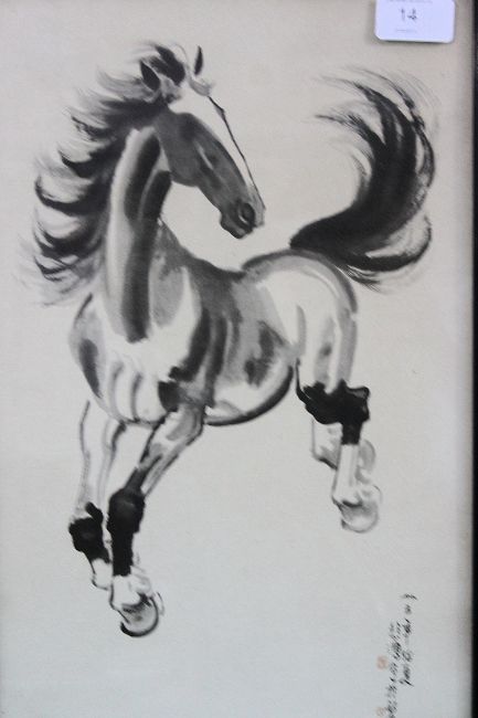 A Chinese watercolour print / painting depicting a horse bearing chinese character marks . The pictures is marked with chinese characters on the side. Measures: 40cms H x 25cms W.