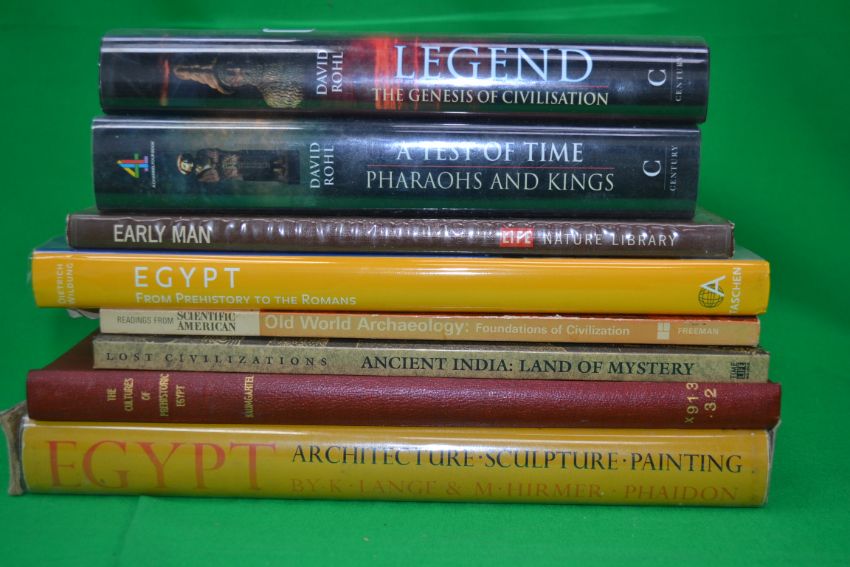 Ancient Civilisations of Egypt and India, a collection of hardback references to include Egypt by Lange and Hirmer,Legend and A Test of Time both by David Rohl,The Cultures Of Prehistoric Egypt -Baumgartel. 8 books in total.